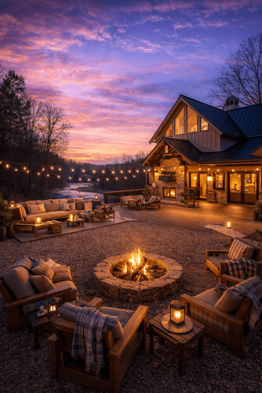 a spacious wraparound deck adorned with cozy seating and string lights. It's rustic luxury at its finest.